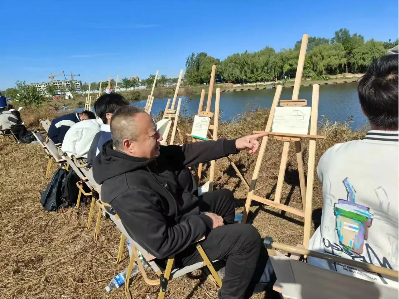 在写生过程中,专业老师始终陪伴在学生身边,给予他们悉心的指导,并对他们的画作进行细致的点评。这种以引导式、反思式学习为核心的教学方法,不仅为学生们提供了一个对写生实践进行深入总结的平台,更创造了一个促进深度学习和思考的机会。一方面,老师通过提问和引导,鼓励学生深入分析自己的作品,从构图、色彩到光影,发现创作中的亮点与不足。学生在老师的点拨下进行自我反思,思考如何改进。同时,互动式教学让学生相互讨论,分享见解,促进知识的交流和灵感的碰撞。