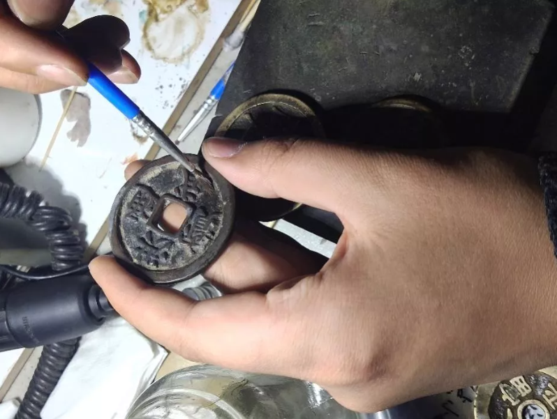 我们的修复实习工作主要内容为铜镜、古钱币的配补,以及对一些特殊币种的修复,如花钱的补配、焊接、粘接、冷焊、激光焊等修复操作。