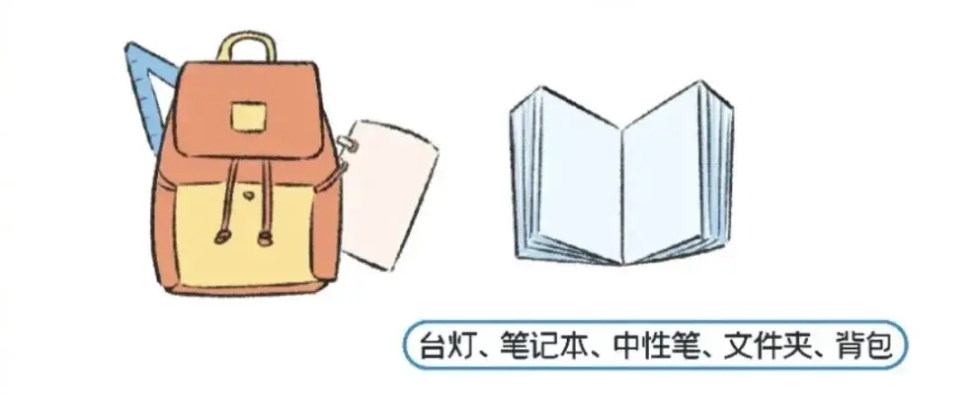 签字笔、笔记本、订书机、回形针、文件夹、固体胶、书包等