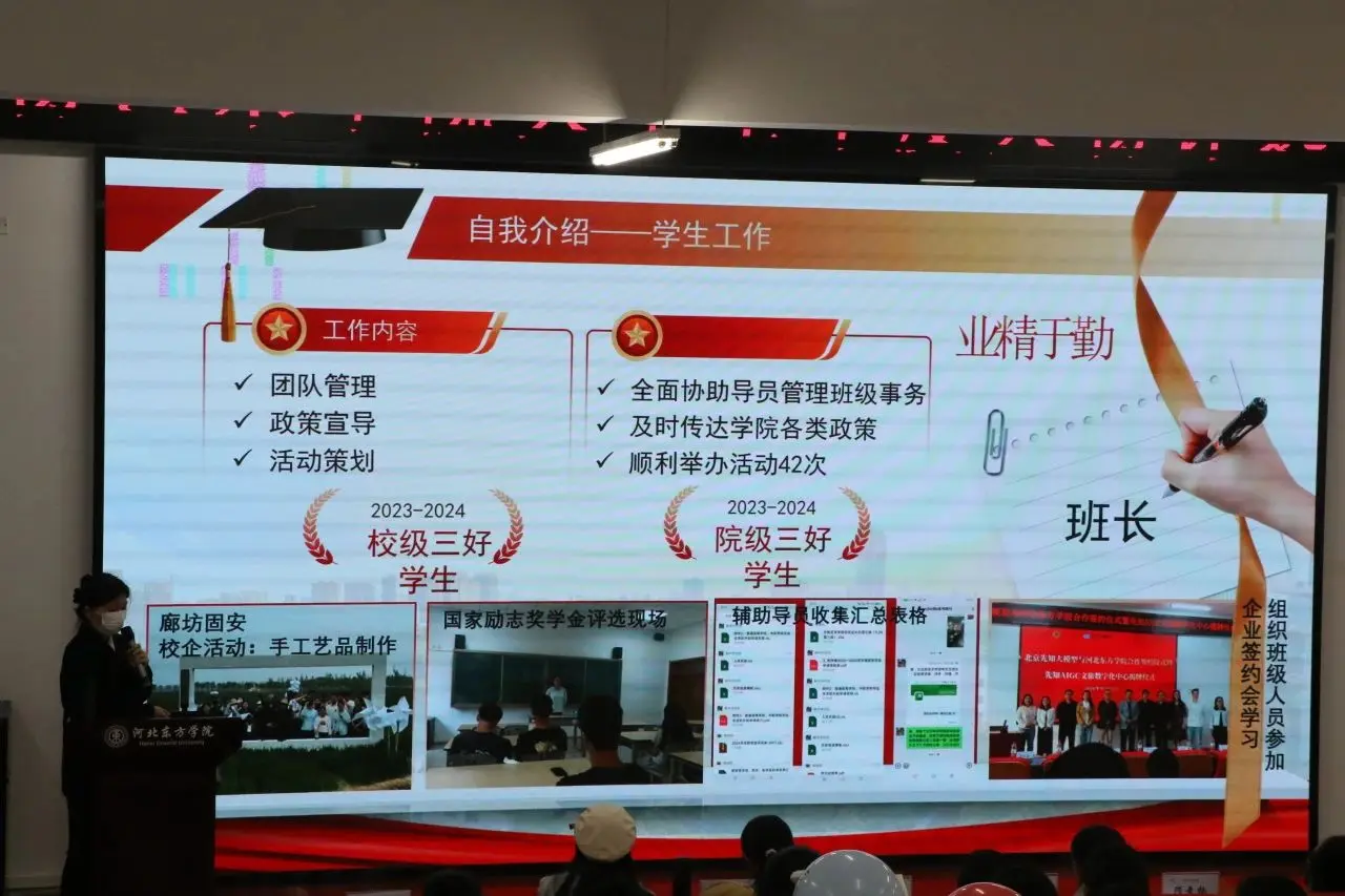 1.  候选人通过自我介绍、事迹陈述、荣誉展示、未来规划等方式,全面展示自己的综合素质和优秀事迹。他们的表现不仅赢得了现场一阵阵热烈的掌声,还充分展现了当代大学生积极向上的精神风貌,赢得了评委老师们的高度评价和一致好评。
