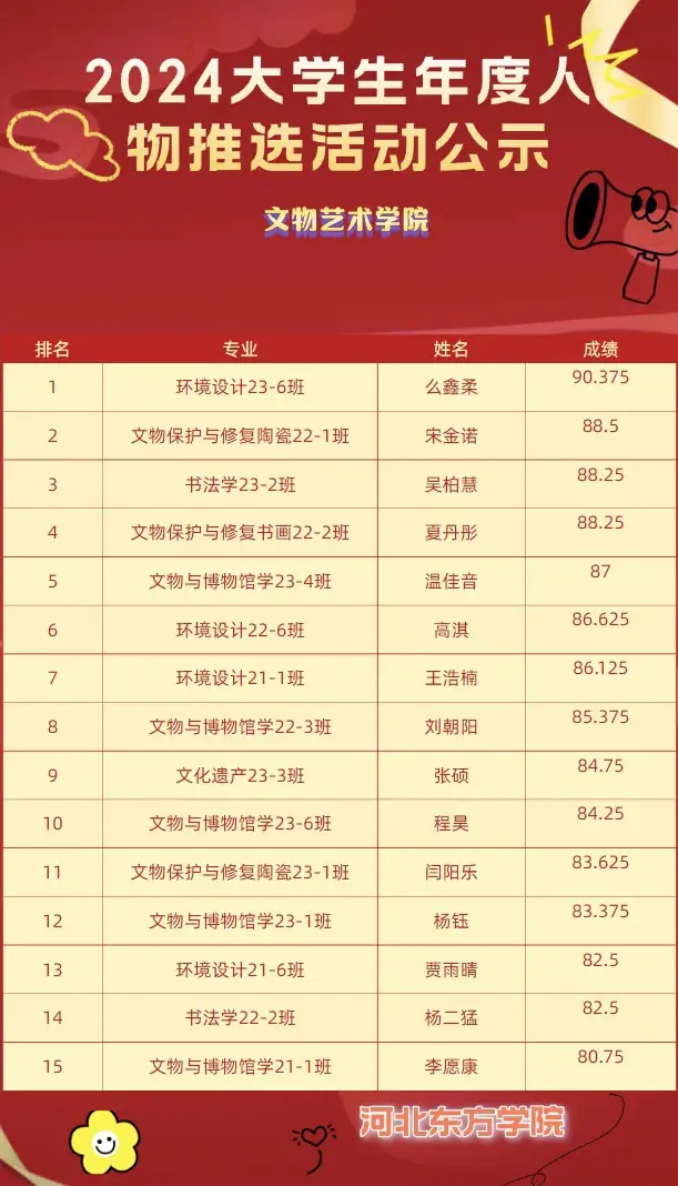 2.  经过同学们激烈的演讲,评委们分别从演讲内容、语言表达、具有突出的专业技能、乐观的积极态度和综合印象等方面进行评分,最终在这15位优秀同学根据评分的先后顺序,并且按照公平、公正、公开的原则择优选取并且向学校推荐最佳优秀同学人选: