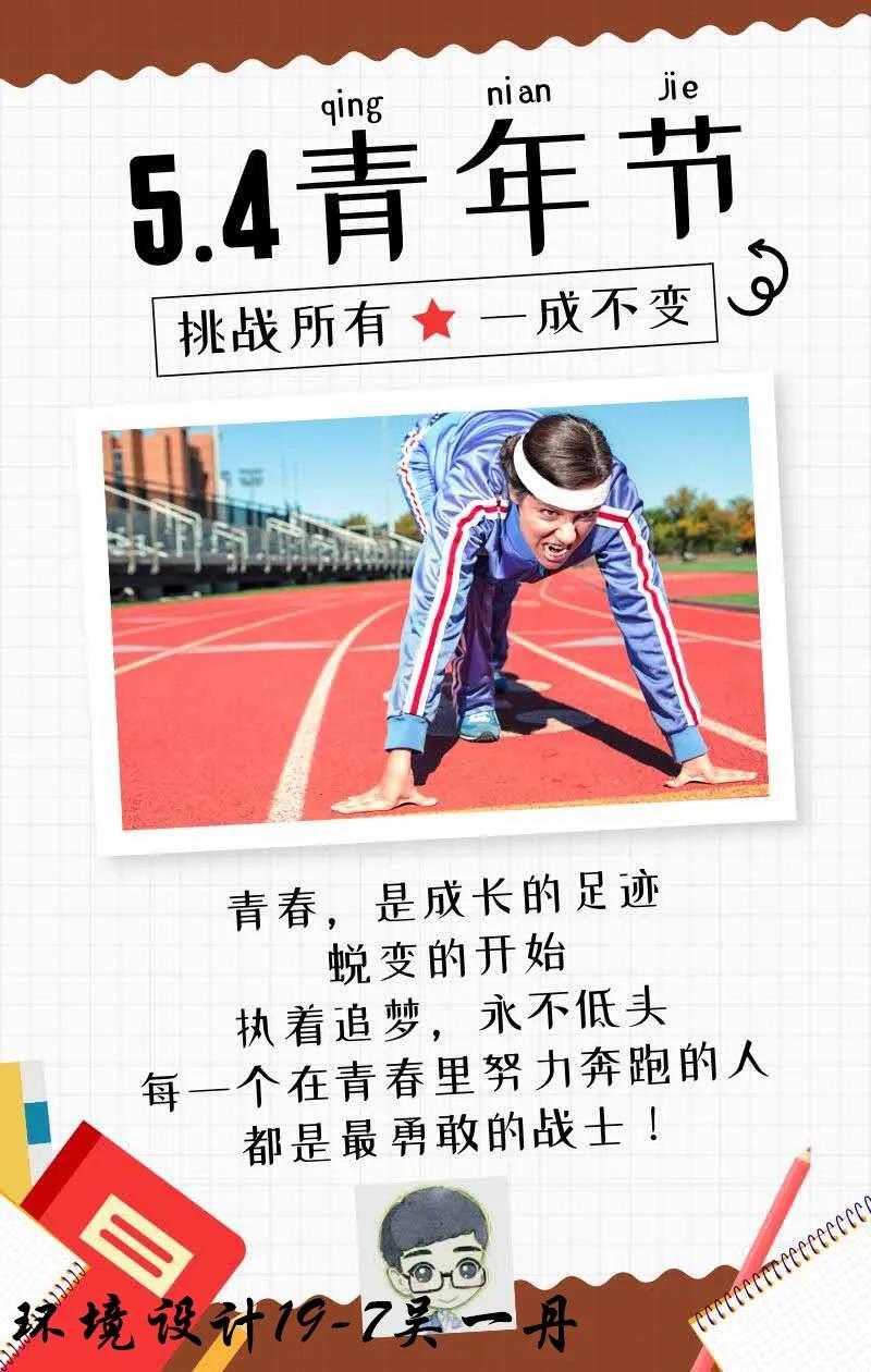 创作说明:悠长跑道上,女孩头系白带,目光坚毅的望向远方。我们知道,她定会以胜利者的姿态抵达终点。五四精神代代传承,衍望至今已蜕变成一种时代精神:自强不息,顽强拼搏。激励着中华青年执着追梦,即使前方艰难险阻,我们永不低头!青春是成长的足迹、蜕变的开始,我们甘于挑战一成不变,每一个在青春里努力奔跑的的人,都是最勇敢的战士!