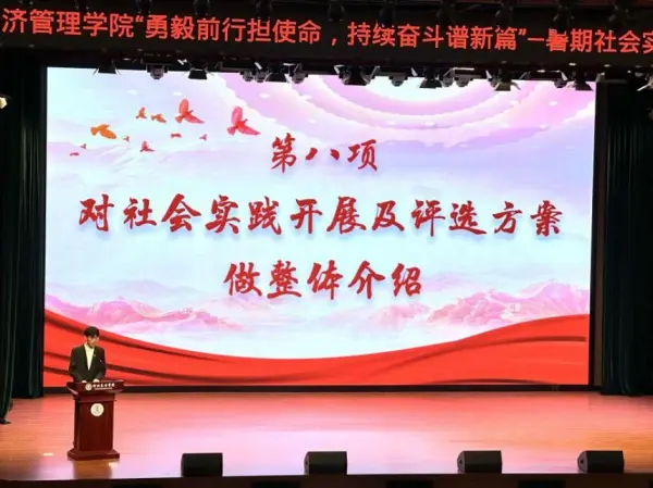 为深入学习宣传习近平新时代中国特色社会主义思想及党的二十大精神,贯彻落实习近平总书记关于青年工作的重要思想,引导和帮助广大青年学生上好与实践相结合的“大思政课”。我院于6月26日在文华楼多功能报告厅顺利举办了“勇毅前行担使命,接续奋斗谱新篇”暑期社会实践出征仪式。本次大会由王子阳同学主持,经济管理学院党总支王琬琦书记、学生科王尚杰科长以及辅导员代表出席会议。