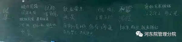 接着,在王晓飞院长的提议下,各位老师现场讨论了 “我希望我所在的团队是什么样的团队?”这个议题。大家踊跃发言,并把自己所想的关键词亲自写在了黑板上。吕一枚校长为此作了精彩的点评:“这是一所有温度的大学……”,并即兴朗诵了一首诗,获得了热烈的掌声。