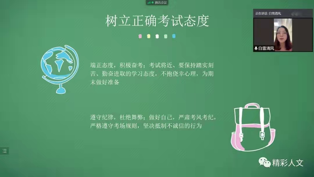 班会过程中,辅导员老师指出同学们应端正学习态度,提前进入复习状态,制定科学合理的复习计划,全力备战考试。并重点强调,考试期间拒绝作弊行为,同学们应当遵守考场纪律,服从监考老师管理,塑造诚实、守信的在校大学生形象。