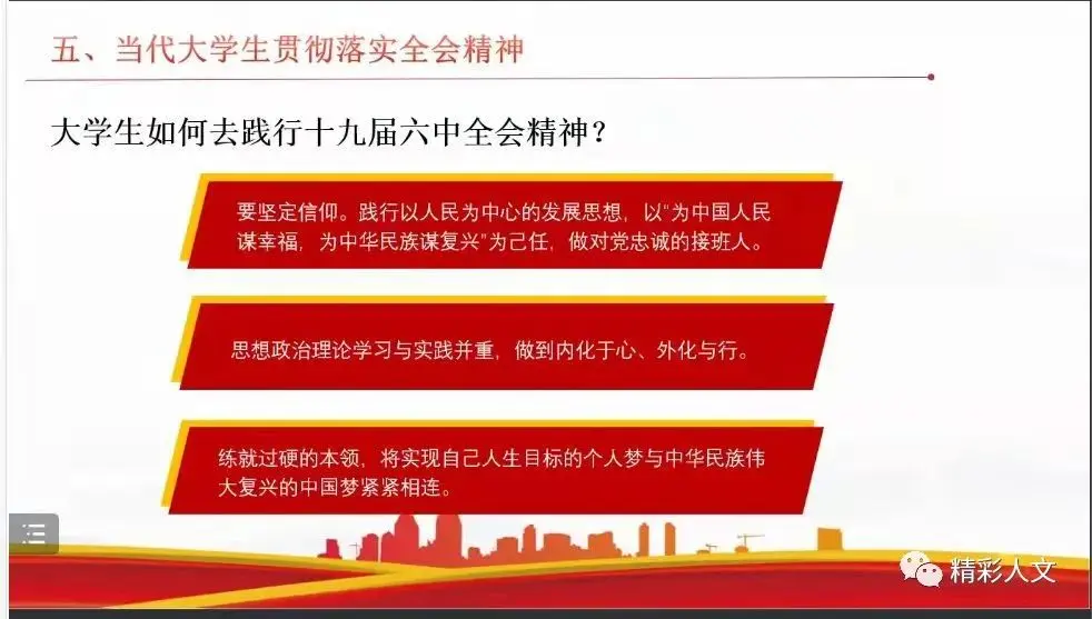 会议最后,李梦娇老师给学生列举了作为当代大学生的我们应如何贯彻落实全会精神。表示对学生抱有殷切的希望。生逢盛世,当不负盛世,此生愿以寸心寄华夏,且将岁月赠山河。愿所有青年们,牢记自己的使命,努力提升自己,为祖国的繁荣昌盛奋斗终身。