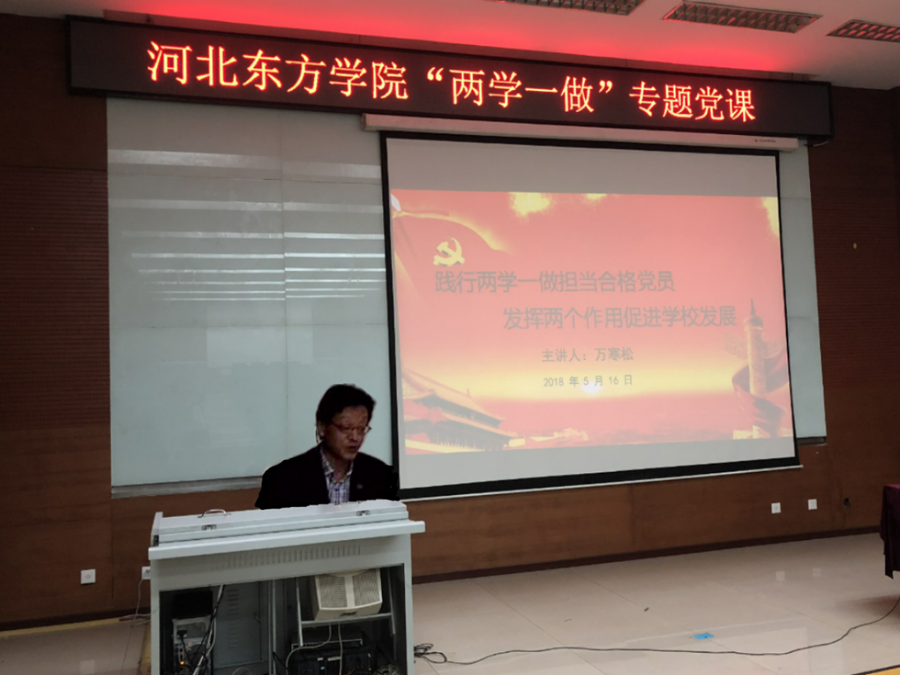 为进一步深化对习近平新时代中国特色社会主义思想和党的十九大精神的学习贯彻,积极推进“两学一做”学习教育常态化制度化工作扎实开展,认真落实书记讲党课的党建工作要求,2018年5月16日下午,学院党委书记万寒松以“践行两学一做担当合格党员,发挥两个作用促进学校发展”为主题,讲授专题党课。党委副书记潘冲主持党课,学院全体党员、入党积极分子参加学习。