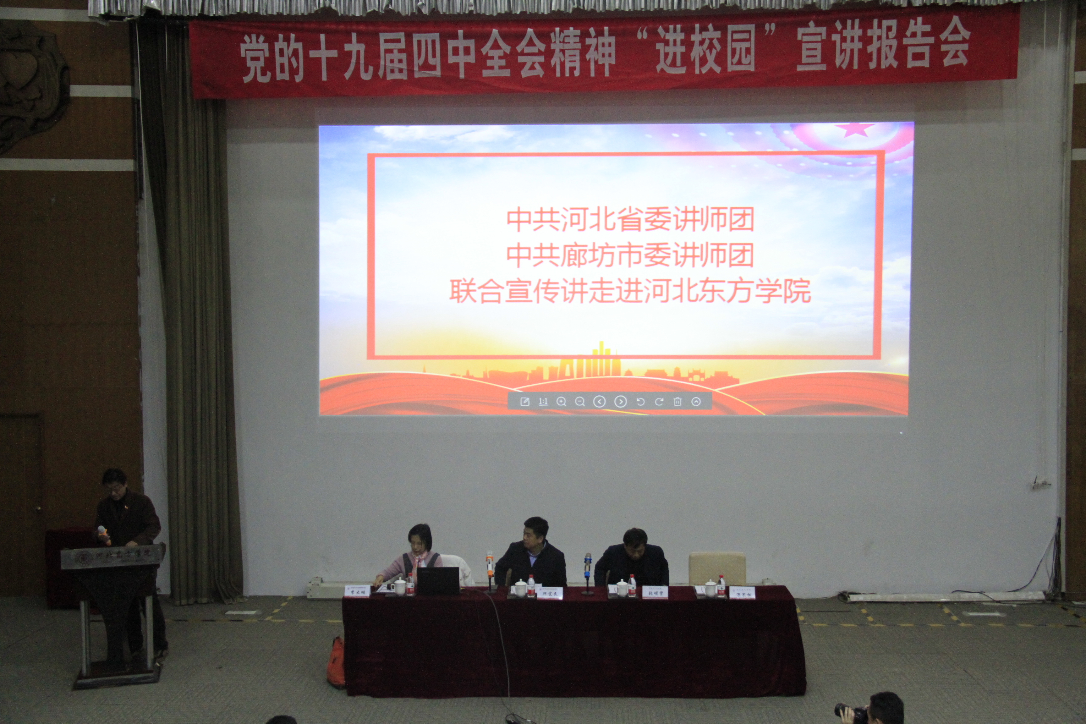 2019年12月19日下午,河北省委讲师团与廊坊市委讲师团联合宣讲团一行走进环球ug登录网站,向广大师生宣讲党的十九届四中全会精神。