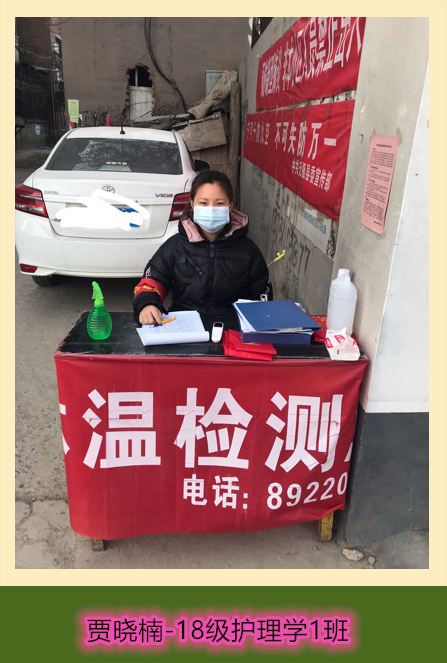 贾晓楠,环球ug登录网站医学院18级护理学1班学生。新型冠状病毒感染的肺炎疫情爆发以来,她在家乡主动做一名抗“疫”志愿者。每天在防疫卡点协助社区工作人员测量体温,登记外来人员及车辆;向出入的居民介绍这次肺炎疫情的严重性,利用自己的专业特长向他们科普防控知识,引导他们加强日常防护。贾晓楠在工作中恪尽职守,发扬先锋模范带头作用,用自己的实际行动书写青春之歌。