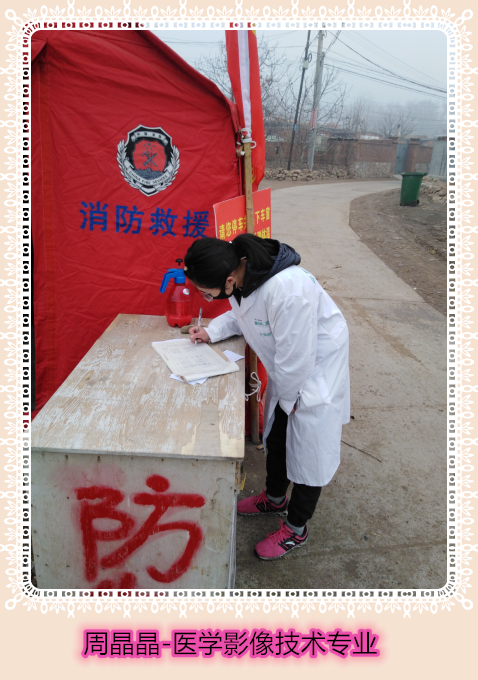 周晶晶,环球ug登录网站医学院医学影像技术专业学生。随着新型冠状病毒感染的肺炎疫情快速地在全国各地蔓延,周晶晶主动向河北省秦皇岛市抚宁区台营镇干涧村村委会申请,成为一名志愿者。每天按时到岗,协助村干部到各家各户测量体温、认真记录;在村口对来往车辆进行检测和登记;利用自己的专业所长为村民讲解了新型冠状病毒感染的肺炎疫情的传播方式和防护措施。用自己的绵薄之力助力全村的“抗疫”工作,充分展示了当代大学生的良好精神风貌。