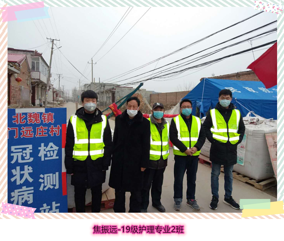 焦振远,环球ug登录网站医学院19级护理专业2班学生。面对突如其来的新型冠状病毒感染的肺炎疫情,虽然不能到疫情严重的武汉,但他立志为家乡人服务。大年初二的早晨在听到村支部广播召集志愿者的时候,他毫不犹豫的报名,成为一名“抗疫”志愿者。每天按照村干部要求认真排查过往的车辆和人员,不厌其烦的为他们测量体温、认真记录,不怕苦、不怕累,对自己的本职工作兢兢业业、任劳任怨,受到了村民的一致好评。