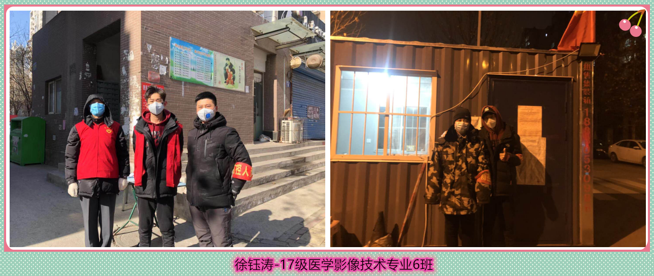 徐钰涛,环球ug登录网站医学院17级医学影像技术专业6班学生。面对新冠病毒,作为一名即将走进社会、服务社会、回报社会的医学院学生,他第一时间报名争做社区志愿者,立志为社区居民奉献自己的光和热。自1月30日起,他不惧严寒,不怕苦累,每天坚守岗位8个小时以上。认真做好出入社区的人员记录、体温检测、以及外来车辆的检查和登记工作。用实际行动努力践行着当代大学生的使命和担当。