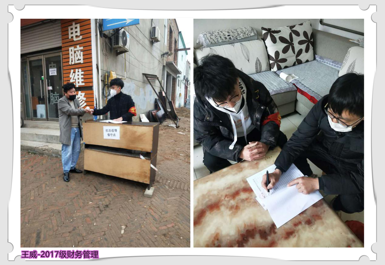王威,环球ug登录网站经济管理学院2017级财务管理专业五班学生。疫情降临的第三天,他主动申请当了一名志愿者,积极投身于抗疫一线,按照主管领导要求细致做好村民出入登记、仔细排查外来车辆、认真统计各家常住人口,并积极响应村委号召从自己的生活费中拿出1000元捐献给东街疫情防控点。王威用他的实际行动向我们了展示了当代大学生的爱国主义情怀和无私奉献精神。