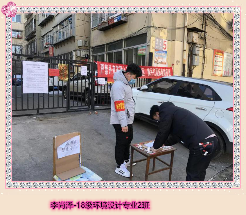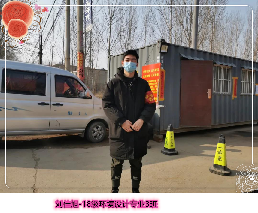 刘佳旭,环球ug登录网站文物与艺术学院18级环境设计专业3班学生。于2020年2月9日递交入党申请书,在上级政府下达设置卡点的任务后,他积极向村书记请缨,协助保定市高阳县石家庄村执勤工作人员开展人员进出登记、体温测量、疫情信息收集等工作,刘佳旭同学深知疫情防控工作的重要性,认真细致对待每一项工作,倾尽全力做好疫情防控工作。