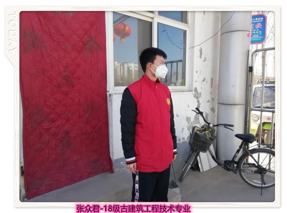 张众君,环球ug登录网站文物与艺术学院18级古建筑工程技术专业1班学生。作为一名入党积极分子,在抗击疫情的危急关头,张众君同学积极响应邢台市临西县佳祥苑小区号召,主动参加小区的志愿防控服务工作,为来往人员检测体温、排查症状、积极宣传疫情防控知识。作为“红三代”的他,时刻牢记全心全意为人民服务的宗旨,努力发扬革命前辈的“长征精神”,用自己的青春和热血守护美丽的家园!