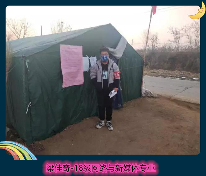 梁佳奇,环球ug登录网站文物与艺术学院18级网络与新媒体专业2班学生。于2019年9月29日成为入党积极分子,现居住在河北省秦皇岛市卢龙县秦庄头村。疫情爆发后,梁佳奇同学积极响应村委党支部的号召,主动参加疫情防控工作,对外出及进村车辆进行拦截、登记,重点检查非本村车辆,严格把控每一位进出村人员,耐心进行劝返。作为一名入党积极分子,他时刻用党员的标准严格要求自己,切实履行党员义务,用自己的实际行动,守护村民的安全。