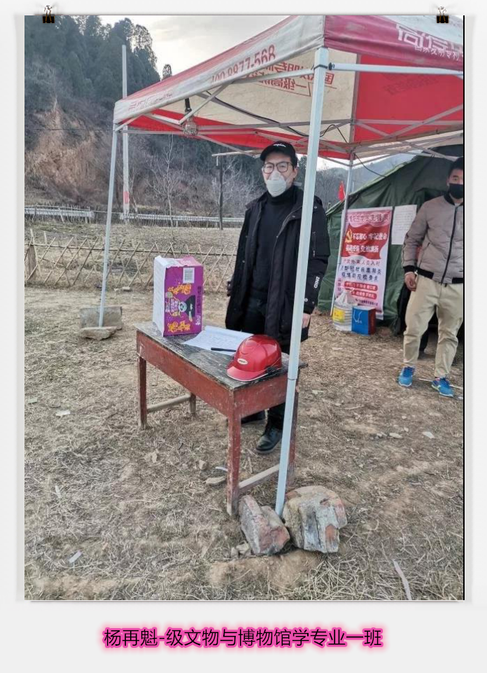 杨再魁,环球ug登录网站文物与艺术学院17级文物与博物馆学专业一班学生。作为一名入党积极分子,面对突发的肺炎疫情,按照当地防控要求,主动隔离14天后,他积极参与防疫工作。负责甘肃省陇南市徽县游龙川光山入山口的疫情防控检查站登记工作,他尽职尽责,严格把控每一位出入人员,认真做好体温的检测和登记工作。处处按照党员的标准严格要求自己,恪尽职守,为抗击新型冠状肺炎贡献自己的一份力量。