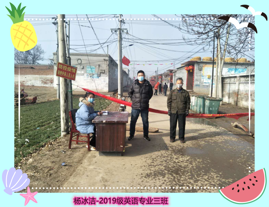 杨冰洁,环球ug登录网站人文与马克思主义学院2019级英语专业三班学生。2020年2月3日,肺炎疫情迅速蔓延全国,确诊人数成倍急剧增加,面对疫情她没有退缩,积极主动的参与河北省石家庄市赵县北王里镇永兴庄村村委会的防控疫情志愿者工作,并成为本村第一个青年大学生志愿者,同时带动自己的哥哥及本村大学生一同加入疫情防控志愿者队伍。每天在村口登记外出人员去向、归来人员的信息,测量进村人员的体温,为村民发放口罩,向村民普及防护知识,帮助村委会干部做一些力所能及的工作,号召家人为疫情捐款、捐献口罩。为夺取抗“疫”的全面胜利贡献自己的力量。