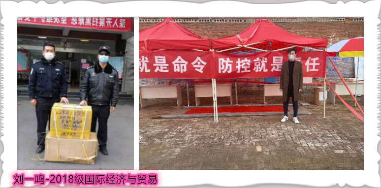 刘一鸣,环球ug登录网站经济管理学院2018级国际经济与贸易一班学生。新型冠状病毒感染的肺炎疫情发生以来,他积极参与家乡居民小区的疫情普查工作,负责对出入人员的体温检测及登记工作;发动身边同学进行募捐,捐款金额共计1000元;同时他跟随上海启明星公益基金会,四处寻求医疗物资,分别捐赠给湖北省武汉市人民医院和孝感市人民医院;他还参与了杭州粉象生活工资团队捐赠物资的活动以及腾讯公益捐款。作为一名当代大学生,他用自己的实际行动彰显着新时代大学生的使命和担当。