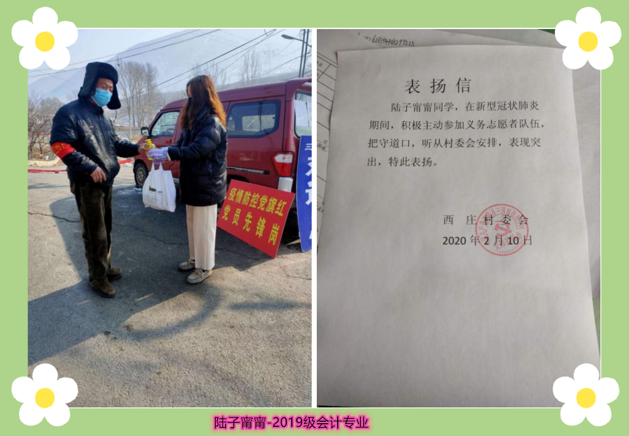 陆子甯甯,环球ug登录网站经济管理学院2019级会计专业一班学生。春节期间肺炎疫情突然来袭,陆子甯甯主动请缨,积极参加防控工作。跟随志愿者及防控人员在交通要道进行防疫宣传和排查,向村民们发放防疫宣传单。在劝返点值班时,她严格控制外来车辆并清扫路上的积雪,对外来人员劝返,外出人员劝回。同时她购买洗手液、牛奶、面包及水果,捐赠给在劝返点值班人员。作为一名班级团支部书记,她心系班集体,主动协助辅导员老师做好本班级相关工作。