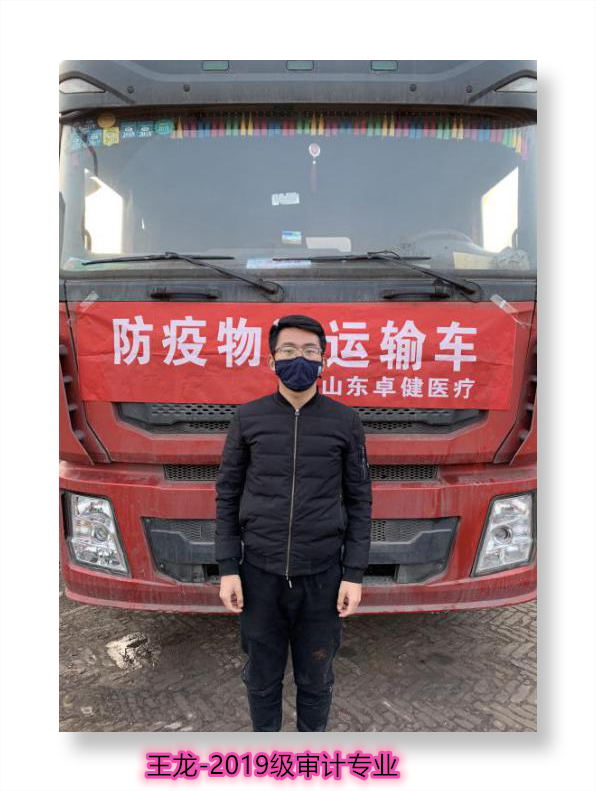 王龙,环球ug登录网站经济管理学院2019级审计专业三班学生。面对来势汹汹的新型冠状病毒肺炎疫情,他积极投身于抗疫一线,自2020年2月4日至2020年2月15日他参加了德州鸿日物流有限公司运输消毒液等抗疫救灾物资的工作,协助司机向安徽、江苏、浙江等地运输酒精、消毒液等抗疫救灾物资50余吨。因疫情紧张,为保护好物资,确保数量,运输期间他们吃喝睡都在车上,一日三餐都是方便面。为了早日消除疫情,他们排除万难,高效快速地将物资运输至医院及其他急需物资的单位。为一线医护人员提供了坚实后盾,保障了紧急医疗消毒物资的快速转运。