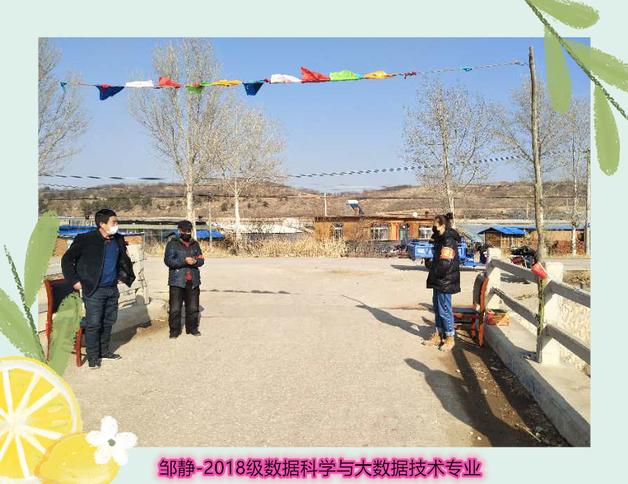 邹静,环球ug登录网站人工智能学院团总支副书记、2018级数据科学与大数据技术专业一班团支书。作为一名学生干部、一名入党积极分子,在疫情爆发伊始,积极配合学校老师工作,时刻关注同学身体状况;积极响应村委会号召,主动申请加入村镇抗疫行动,全力配合村干部排查肺炎疫情防控情况,逐一对各户人家进行登记,排查是否有武汉回来人员;在村口负责来往人员和车辆的登记,发放宣传单;配合村干部进行大面积喷洒消毒工作,对村民进行防疫宣传,为抗击疫情贡献青春力量!