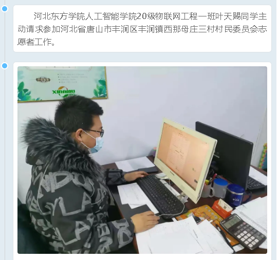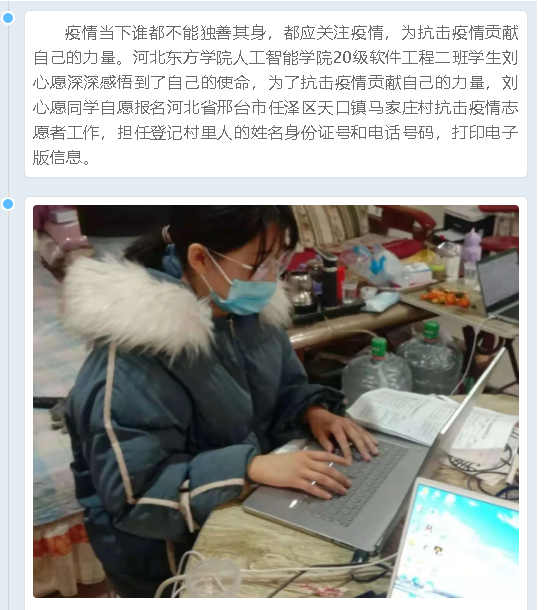 刘心愿同学知道自己的任务十分重要,他在工作中一丝不苟,反复核实检查工作,确保工作的准确无误,保障疫情工作顺利进行。