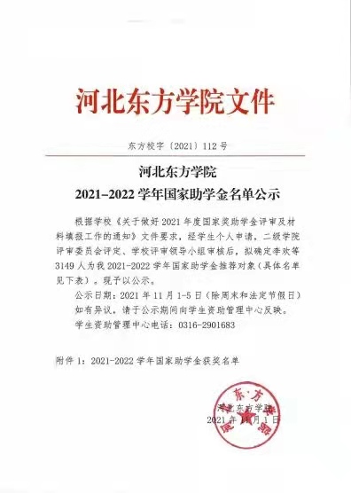 河北东学院2020-2021学年国家励志奖学金名单公示