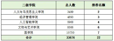 请各二级学院根据实际情况,组织开展本学院的年度人物推选工作。推荐人选信息及事迹应在学院范围内进行公示。按照1500:1的比例推荐,共推荐22名,各分院推荐名额如下表所示: