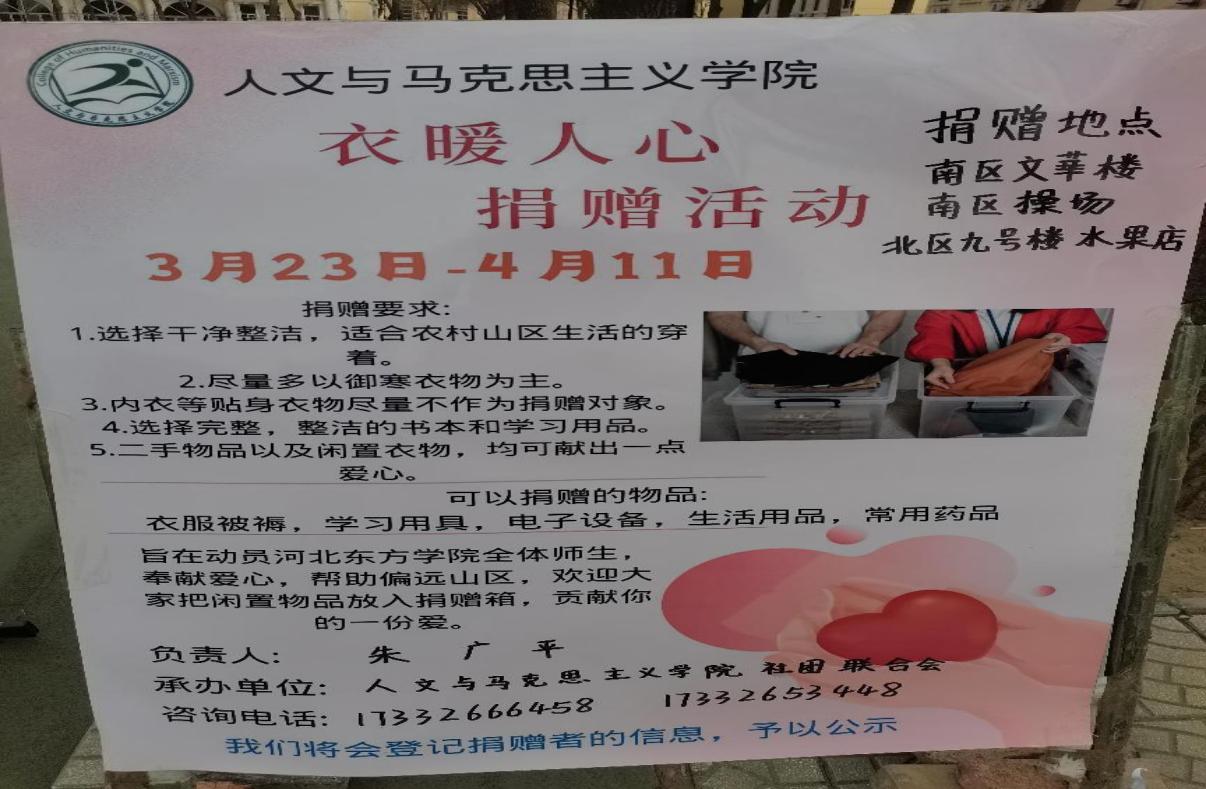 大爱无疆,“衣”暖人心。通过爱心捐赠活动,号召全校师生更多的爱心人士加入活动。在辽阔的中华大地上,有些地方因为地理、经济等多种原因,仍然存在着生活条件相对落后的偏远地区。那里的孩子们,可能因为家庭贫困,无法拥有足够的衣物来抵御严寒的冬天。此时,捐衣活动不仅是一份物质的帮助,更是一份温暖的关怀和希望的传递。使偏远山区家庭的孩子们感受到来自当代大学生的温暖,衣物是生活的必需品,尤其在寒冷的冬季,一件暖和的衣物可能就是一个孩子生命得以延续的保障。送去的衣服不仅可以为当地居民提供保暖,更能让他们感受到外界的关心和帮助,不要被眼前的一些困难和现状所压垮自己!此次活动共计捐物800余件,统一邮寄偏远山区。