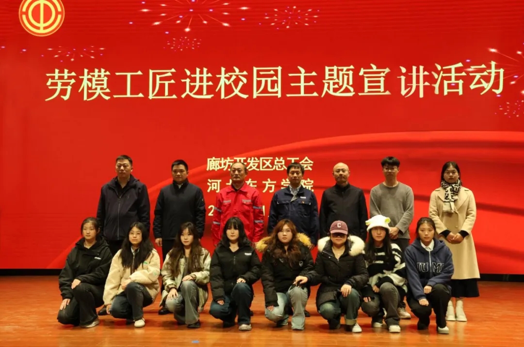 为深入学习贯彻党的二十大和党的二十届三中全会精神,大力弘扬劳模精神、劳动精神和工匠精神,进一步加强新时代大学生劳动教育,11月15日我校与廊坊开发区总工会共同举办“劳模工匠进校园”主题宣讲活动,活动邀请了党的二十大代表、全国劳动模范、廊坊新赛浦特种装备有限公司机修钳工李怀齐和河北省劳动模范、新奥科技发展有限公司工程师杨圆明走进环球ug登录网站“东方大讲堂”作宣讲报告。学校党委副书记潘冲主持宣讲会,廊坊开发区总工会副主席刘运峰,校工会、党委办公室有关负责同志和900余名师生代表参加宣讲会。
