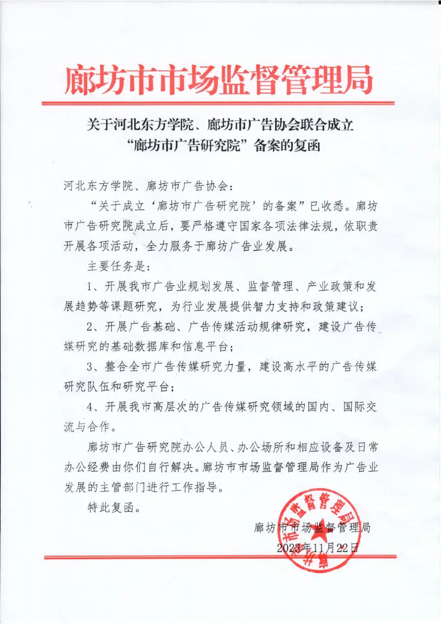 2023年11月22日,廊坊市市场监督管理局复函,通过了环球ug登录网站、廊坊市广告协会联合成立“廊坊市广告研究院”的备案申请。