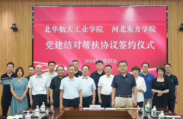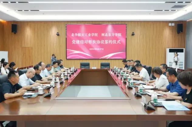 为深入落实省委教育工委《河北省公办高校与民办高校党建结对帮扶实施方案》精神,扎实推进实施党建领航工程、党建提升工程,6月27日下午,我校与北华航天工业学院签署党建结对帮扶协议,北华航天工业学院党委书记郝玉龙、党委副书记王海,环球ug登录网站校长吕一枚、党委书记刘文根、副校长王振武、党委副书记兼副校长赵英树和双方机关职能部门、结对单位基层党组织负责同志参加签约仪式。学校党委副书记潘冲主持签约仪式。