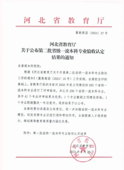近日,河北省教育厅发布了《关于公布第二批省级一流本科专业验收认定的通知》(冀教高函﹝2024﹞27号),我校护理学、财务管理、文物与博物馆学、物联网工程4个本科专业顺利通过验收,正式被认定为省级一流本科专业。