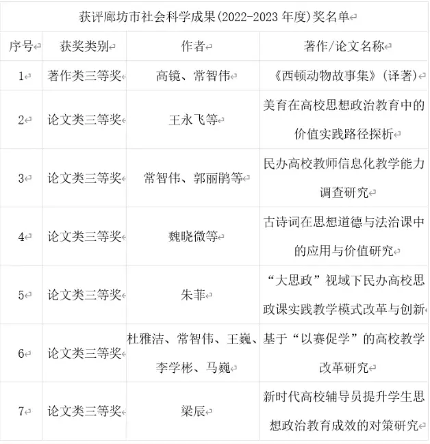 近日,廊坊市人民政府办公室下达了关于廊坊市社会科学成果(2022-2023年度)等级评定结果的通报,我校计有七项成果获评廊坊市社会科学成果奖,名单如下: