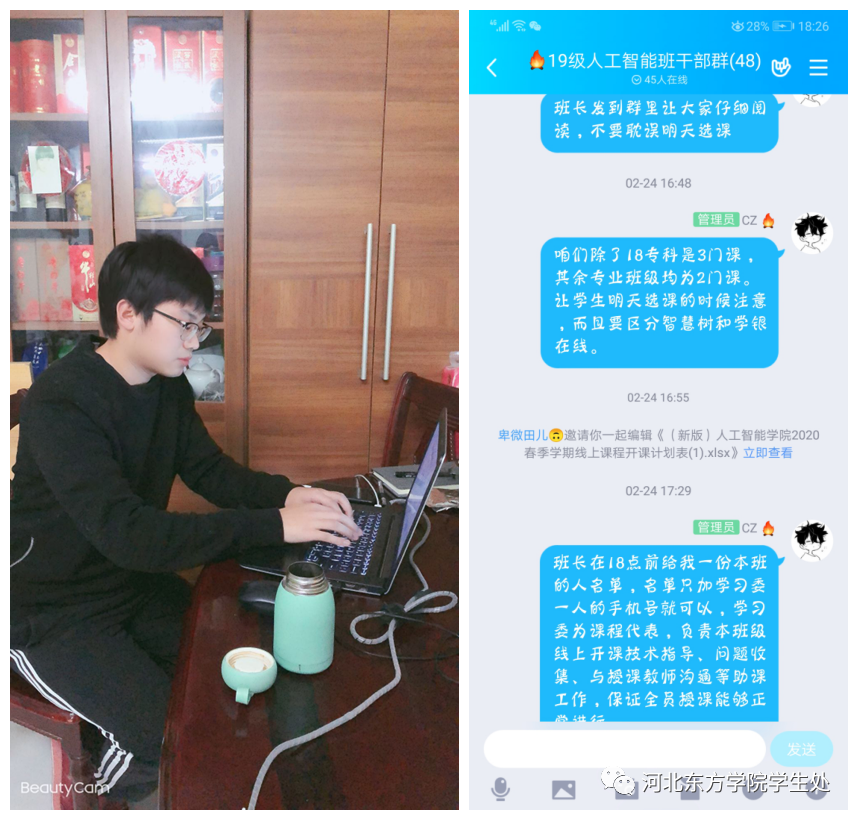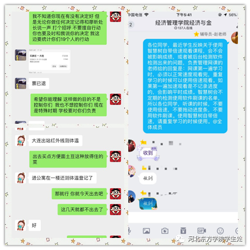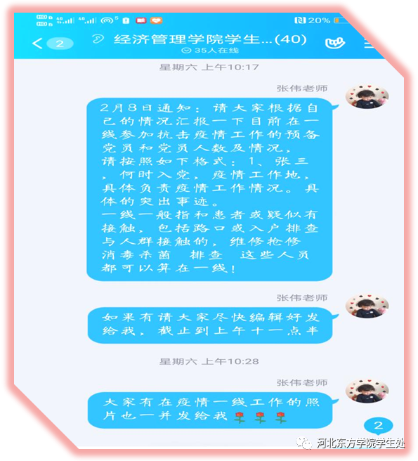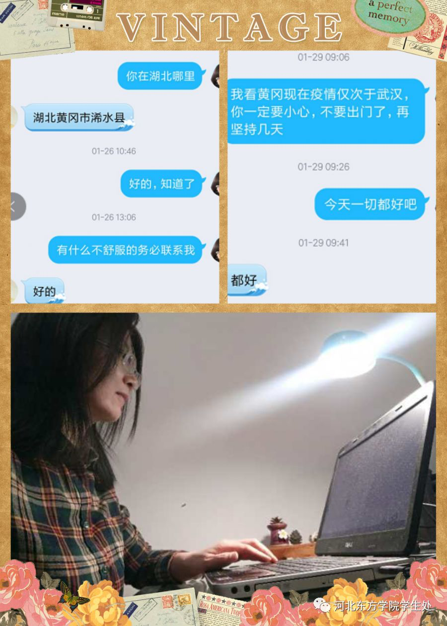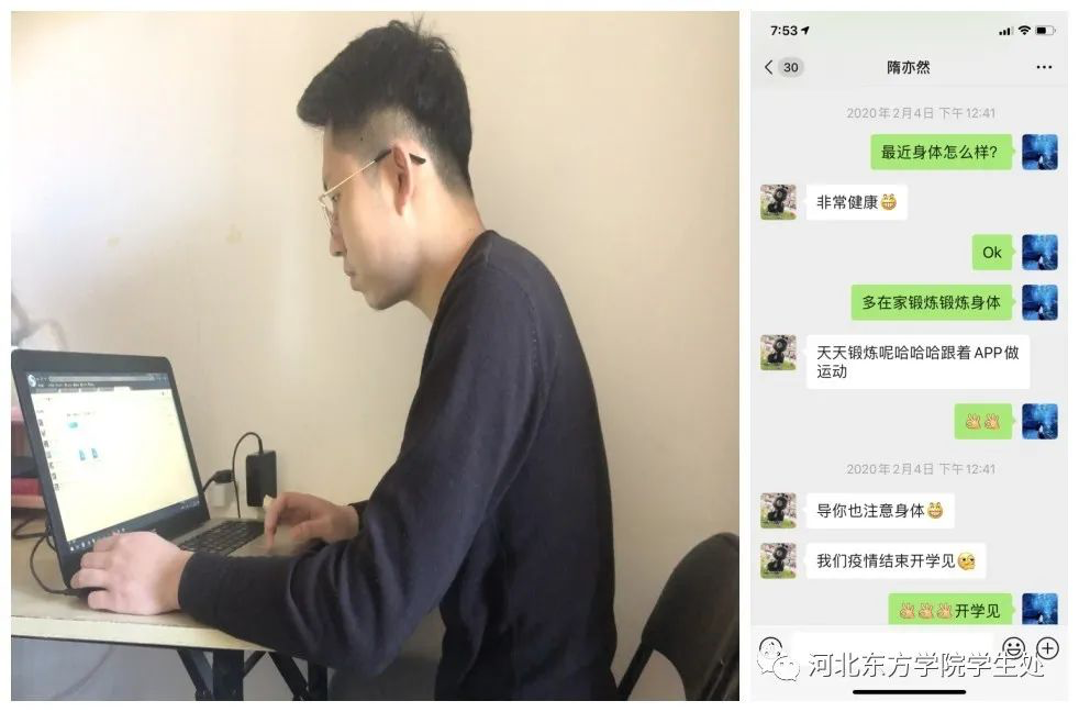 新型冠状病毒感染的肺炎疫情大规模爆发,医学院辅导员祖爽老师,接到学校通知后,立即从“休假状态”转入“战斗状态”,全力做好延期开学准备,每天按时通过微信、qq等媒介,开展“远程管理”,及时发布学校的相关通知。利用位置共享等多种方式,了解学生的行动轨迹、身体健康状况等,时刻关注在廊坊实习的学生情况,实时进行心理疏导,减轻心理压力,传递爱心,一刻都没停歇。疫情使得国民居家隔离,但隔离不了爱,隔离不了辅导员对学生的那份责任和关爱。