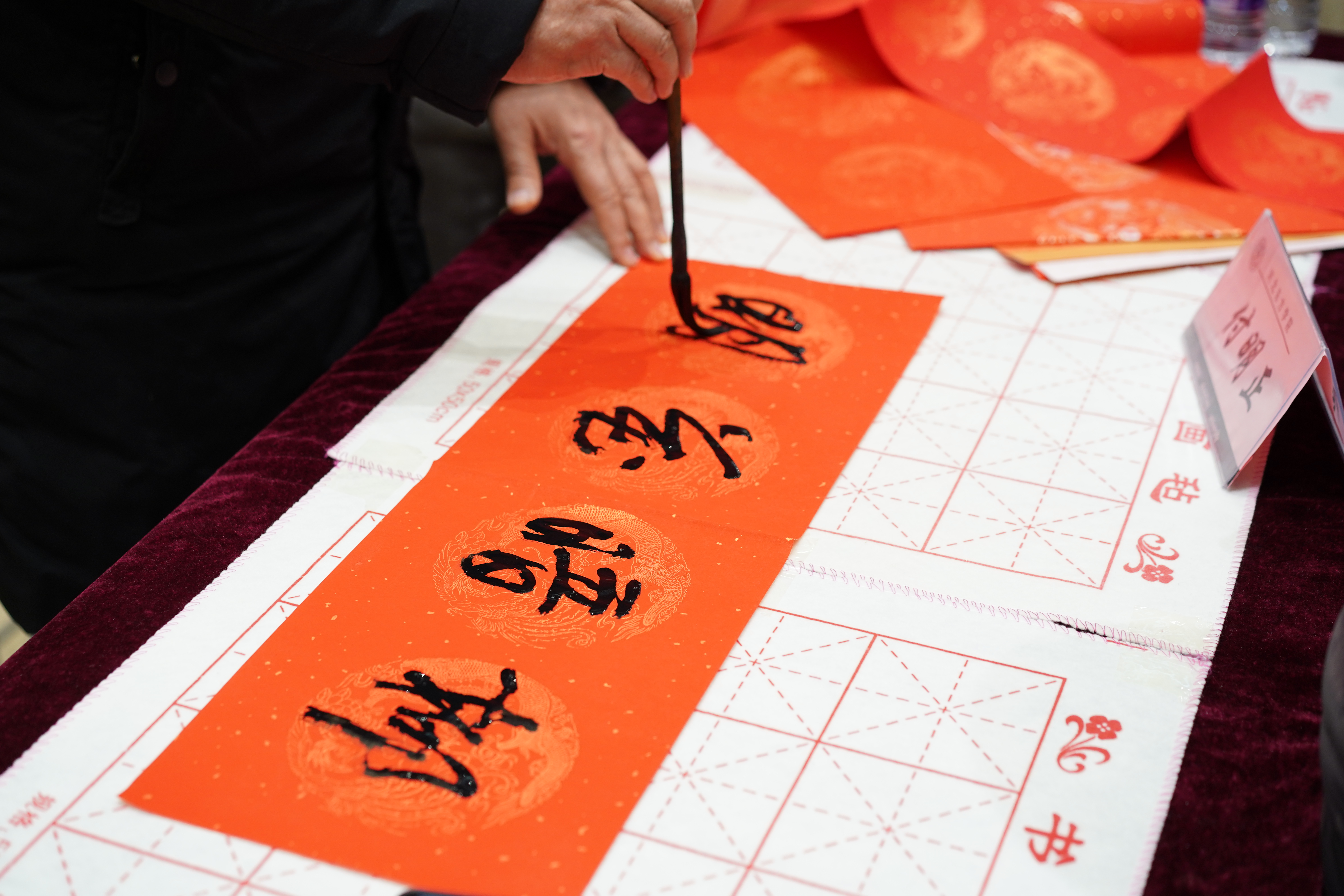 春联派送活动在一阵浓郁的墨香中拉开序幕。铺纸、沾墨、沉吟片刻,在书画教授们的带动下挥毫泼墨,流洒飞动,不一会儿,一副副散发着清新墨香的喜庆大红春联就展现在人们眼前,行、隶、草、篆、楷等多种书体各显神韵。“大地春回人安康,吉星高照家富有”“一帆风顺年年好,万事如意步步高”……往来参观学习的老师同学络绎不绝,他们也在现场领取了一份属于自己的新年祝福——春联和“福”字。火红鲜艳的春联既有辞旧迎新的美好愿景,也有平安吉祥的美丽祝福。