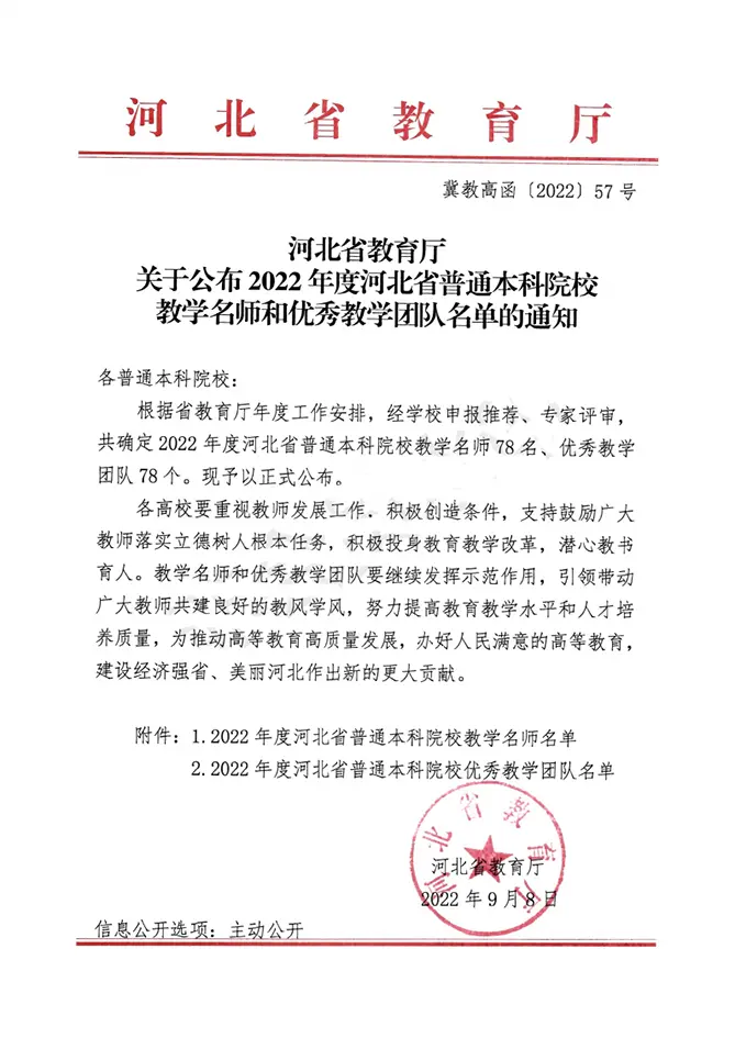 (后附《关于公布2022年度河北省普通本科院教学名师和优秀教学团队名单的通知》图片)