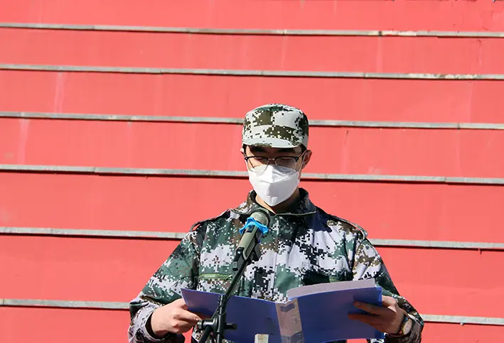 新生代表李潘发言,他以“弘扬时代主旋律 练出青春精气神”为题,表示服从纪律,听从教官指挥,坚忍挺立,面对困难不退缩,锻炼出钢铁般的意志和战胜一切艰难险阻的品质,为大学生活绘上精彩的第一篇章。