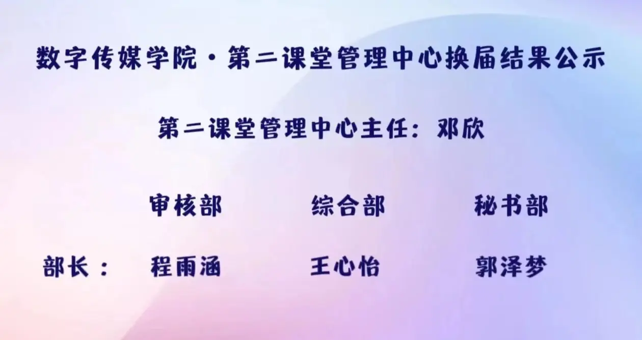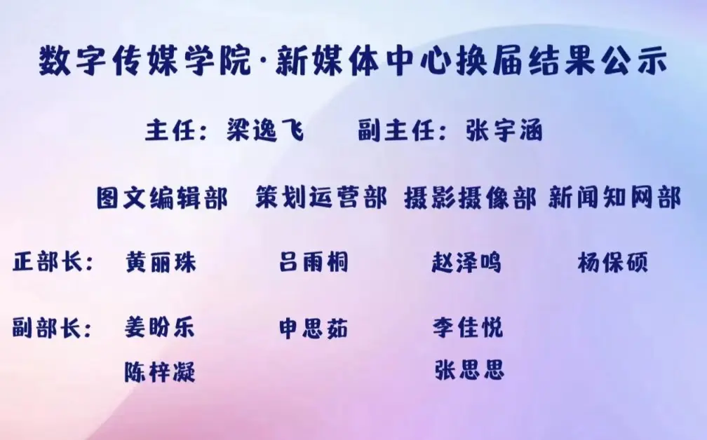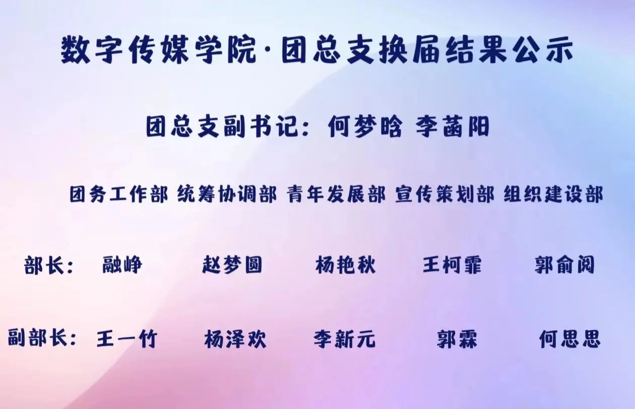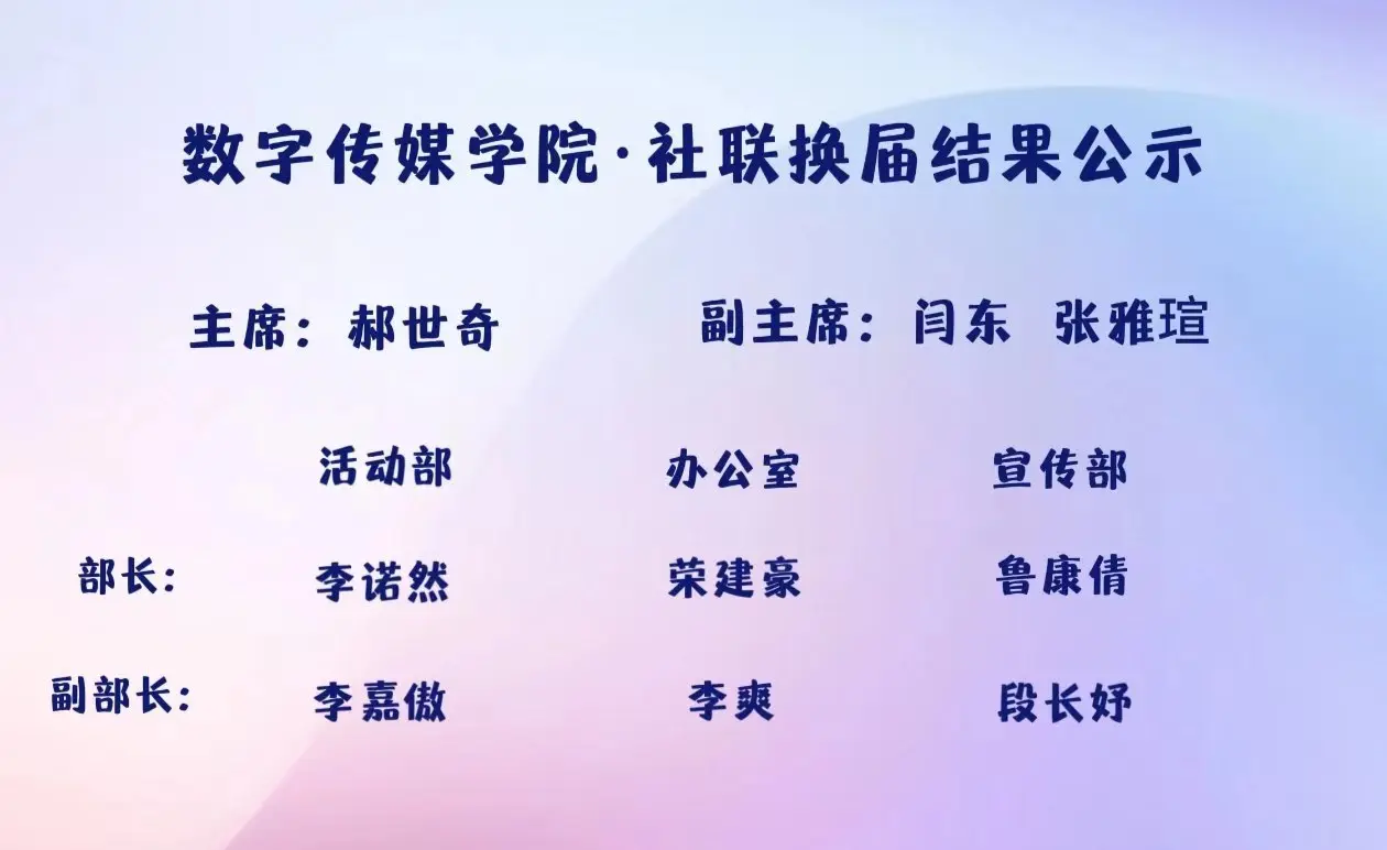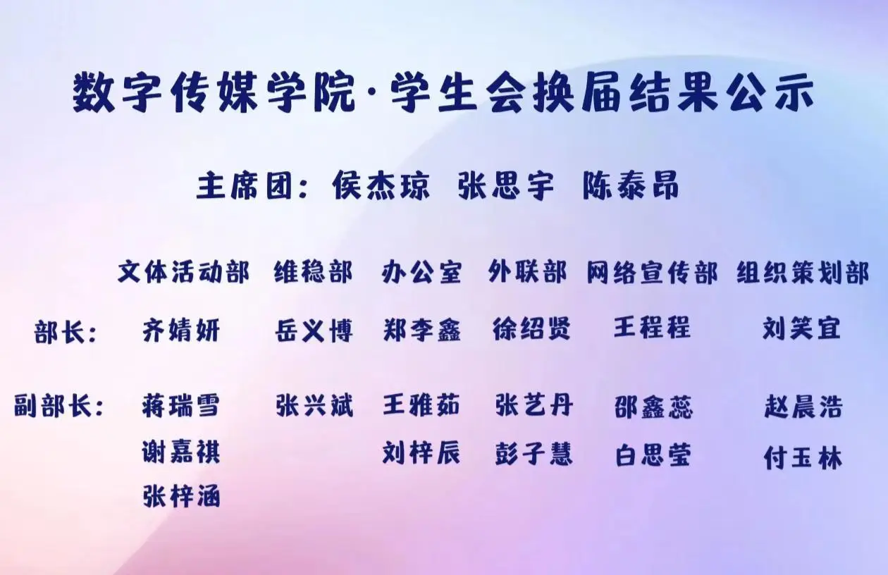 本次换届选举秉持竞争上岗、择优录用的原则,经过自愿报名、面试、投票等严格的选拔程序,现将数字传媒学院2024—2025学年团学组织学生干部名单公示如下: