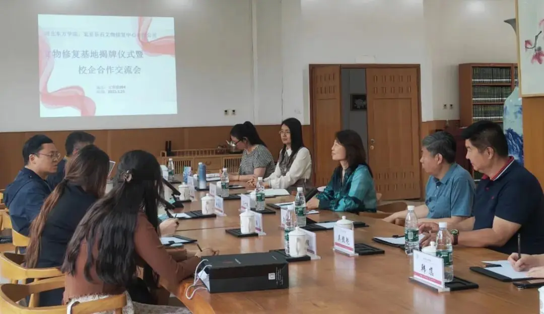 现场参观结束后,双方在会议室开展校企合作交流会。会上,吕一枚校长代表学校对文物保护修复基地的揭牌表示祝贺,对北京乐石文物修复中心关注支持文物保护与修复专业人才的培养,不断深化与学院的校企合作表示感谢。文物保护修复基地落地我校,对实现校企共建、资源共享、成果共有、科研共创等方面将起到的积极推动作用。