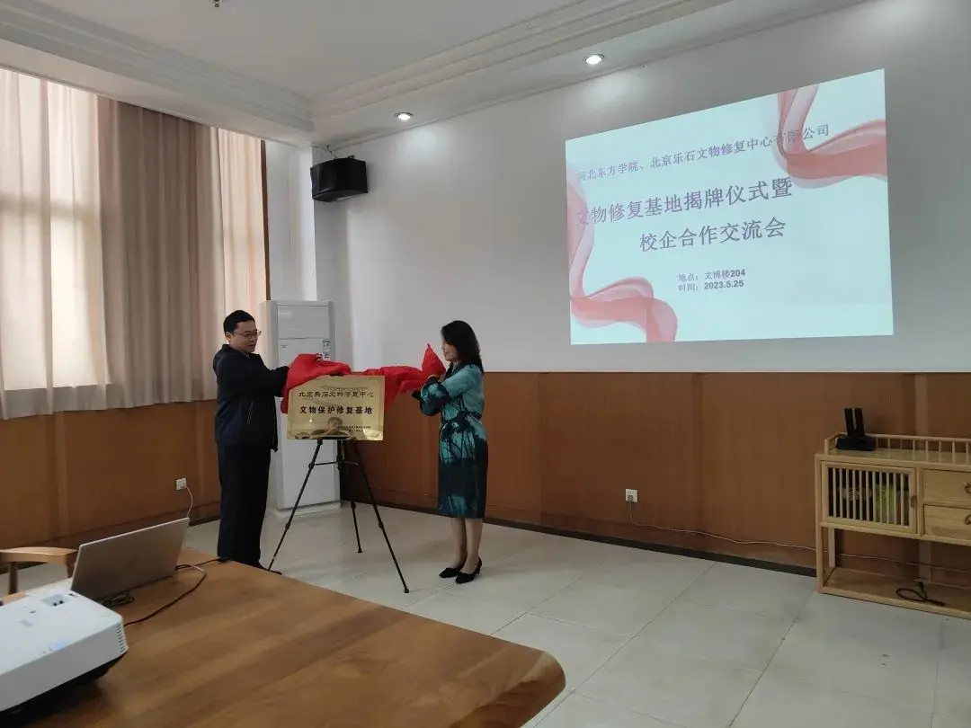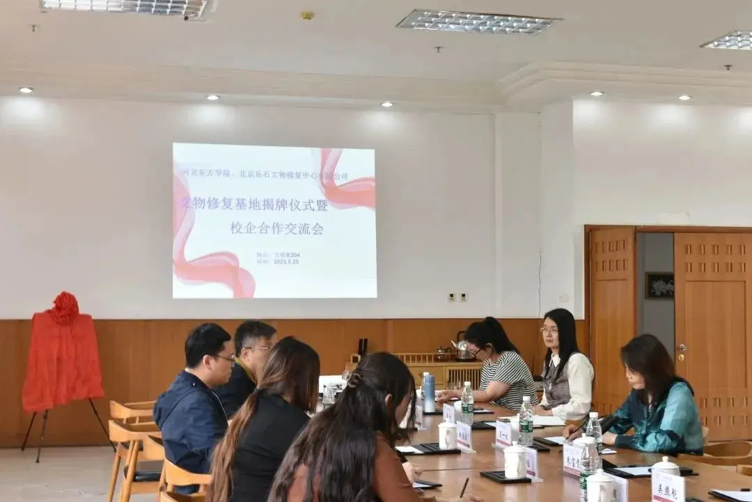 为强化校企合作的育人模式,推进校企合作的有效实施。2023年5月25日,北京乐石文物修复中心董事长赵伯乐、人事行政总监曹崴以及人事行政部主管吕佳莅临环球ug登录网站,参加环球ug登录网站与北京乐石文物修复中心校企合作交流会暨“文物保护修复基地”揭牌仪式。环球ug登录网站吕一枚校长、朱宝贵副校长、就业办廖昕主任、文物与艺术学院吴照魁院长、曲建英书记、文物系刘文月主任等参加此次揭牌仪式。